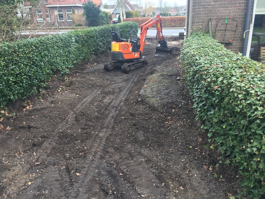 Het volledig bestraten om een woning aan de Nijewei in Gorredijk.