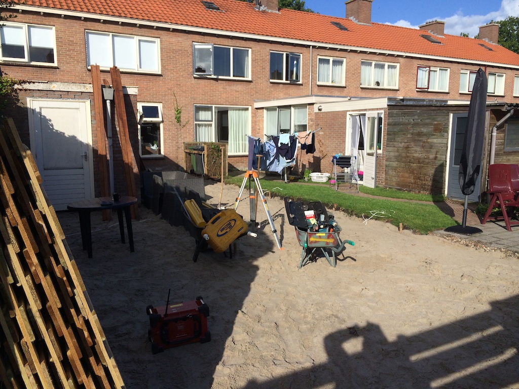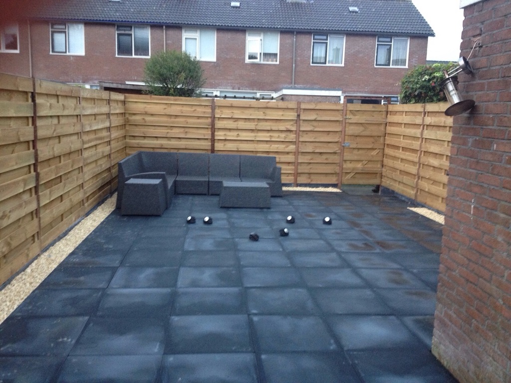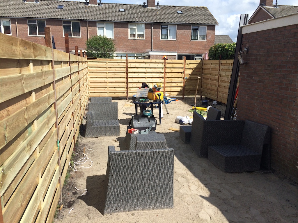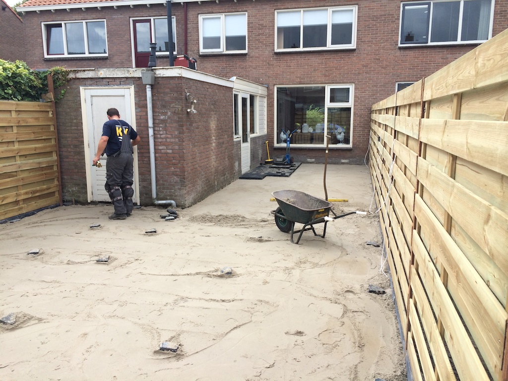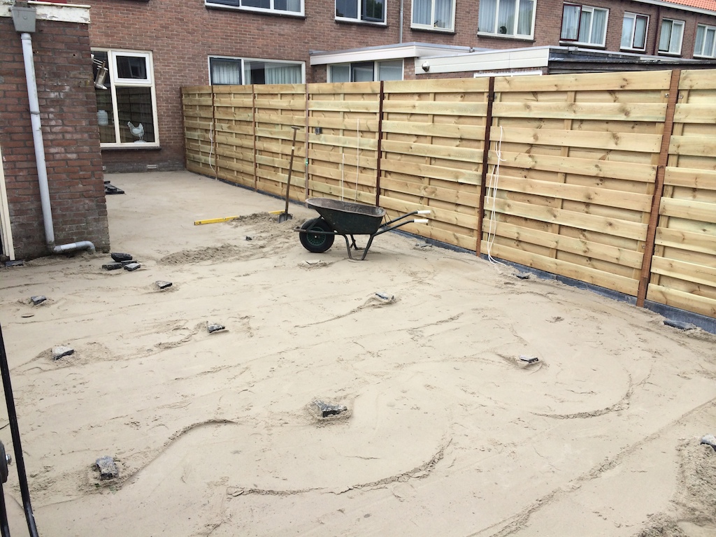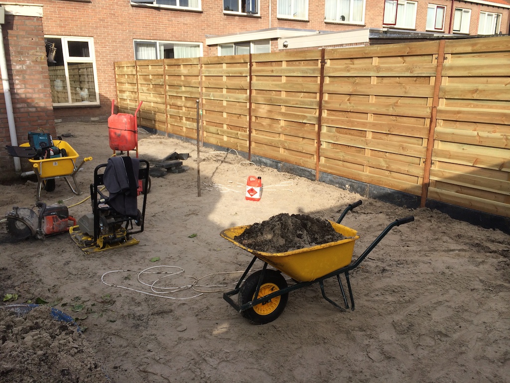 Tuinrenovatie: volledig afgraven, aanvullen witzand en bestrating. Schutting plaatsen.