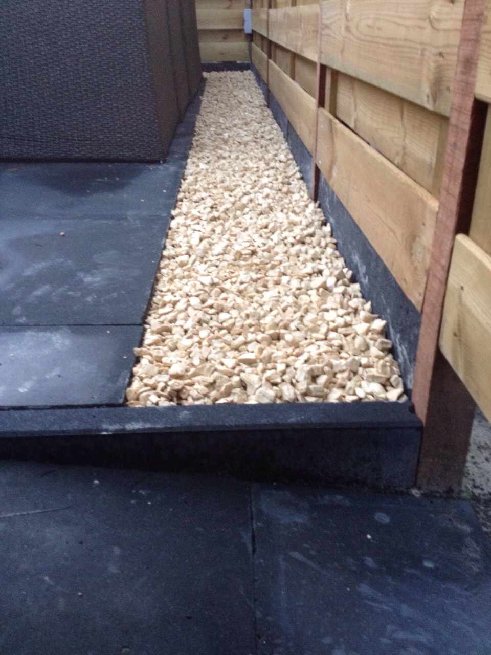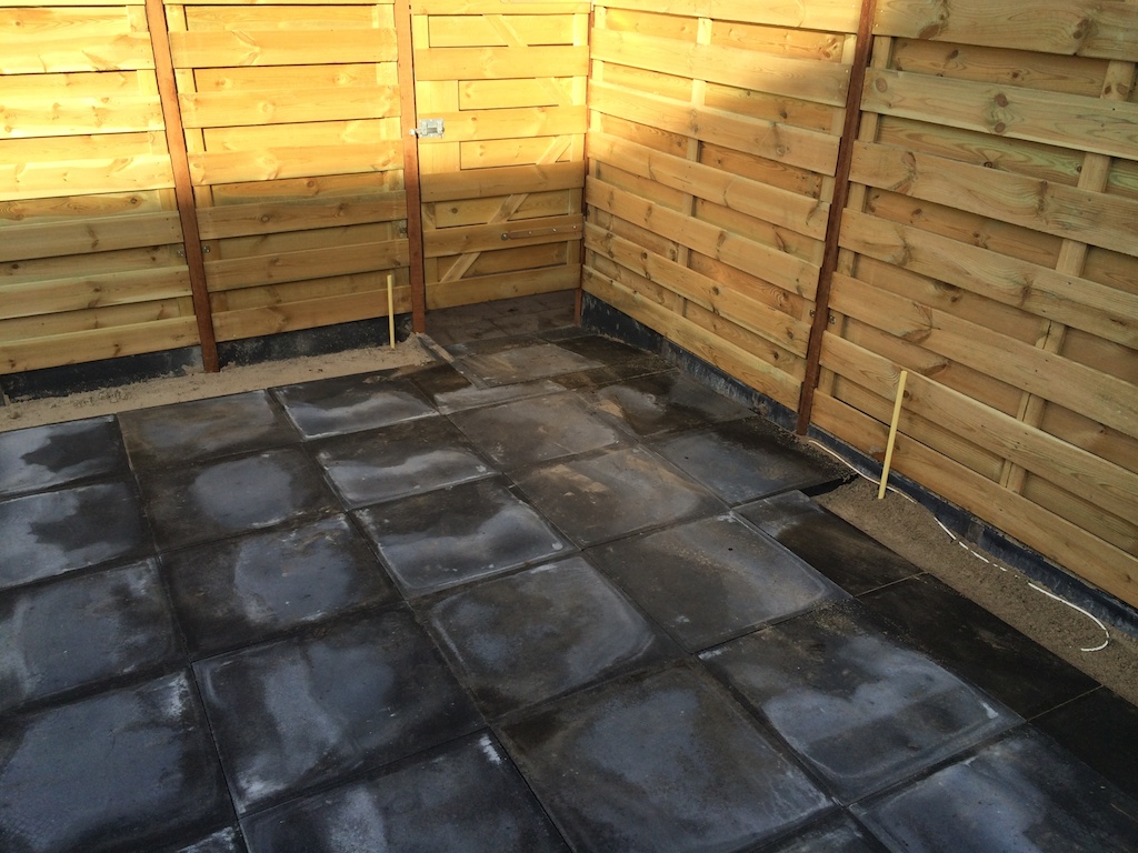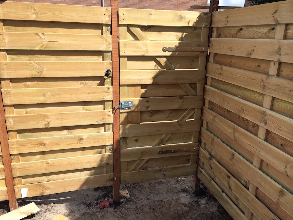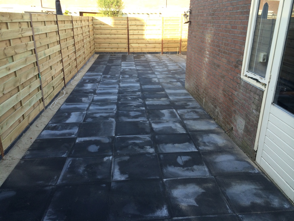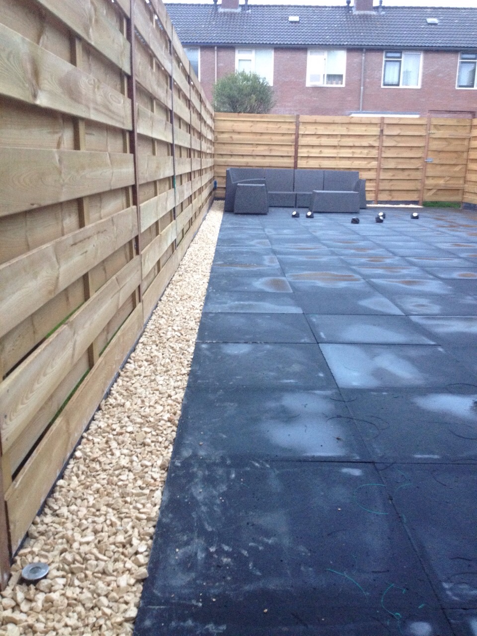 Tuinrenovatie: volledig afgraven, aanvullen witzand en bestrating. Schutting plaatsen.